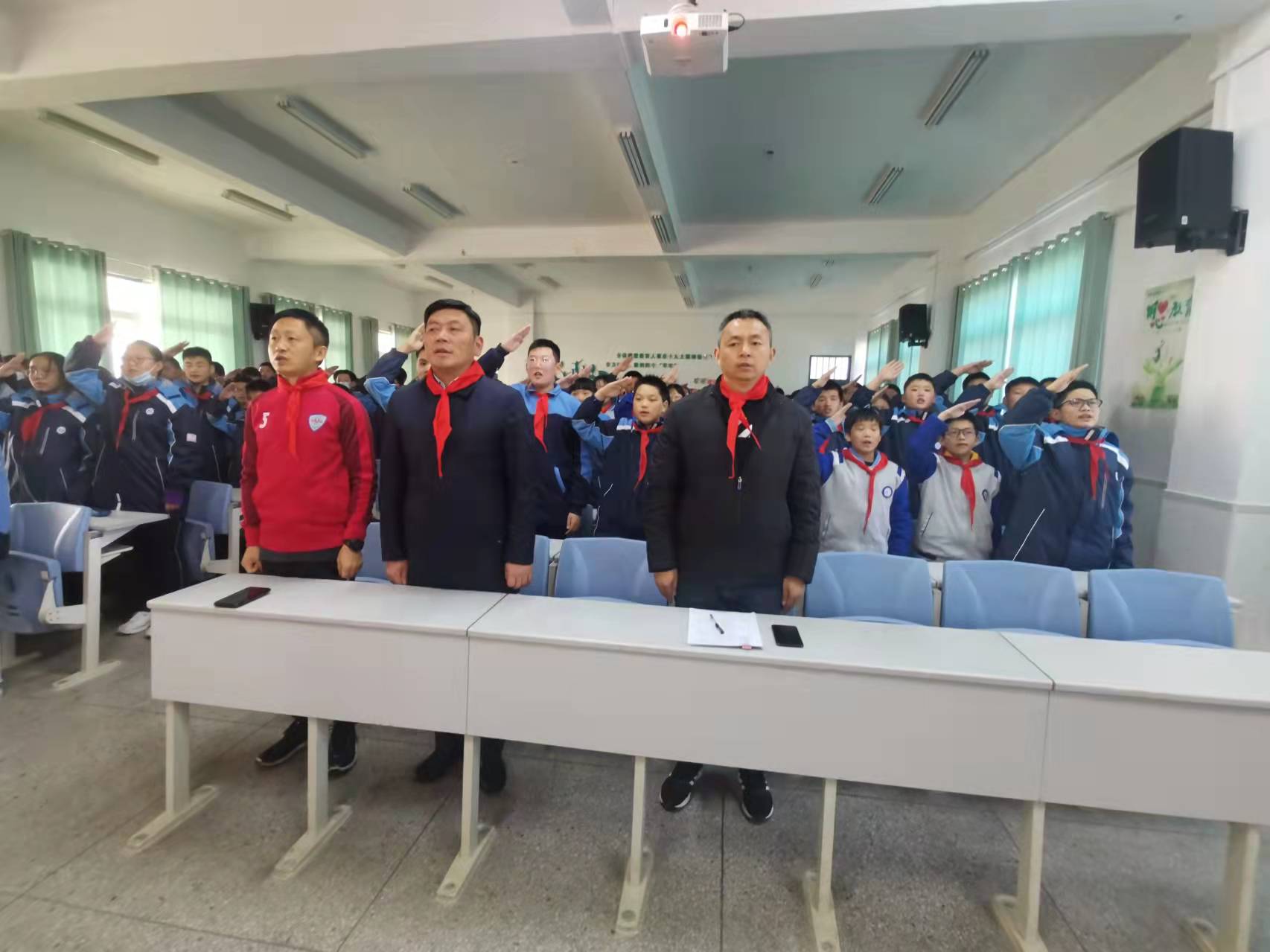 随着高书记宣布七年级建队决议后,由校党支部书记薛良云为各中队授中队旗。