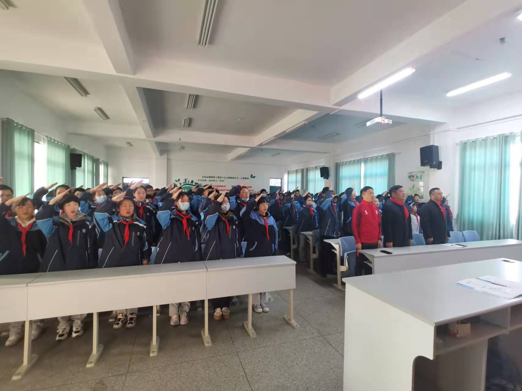 同学们整齐的站姿,高举右手,庄重而严肃的大声歌唱国歌和队歌,让整个报告厅都充满了热血。